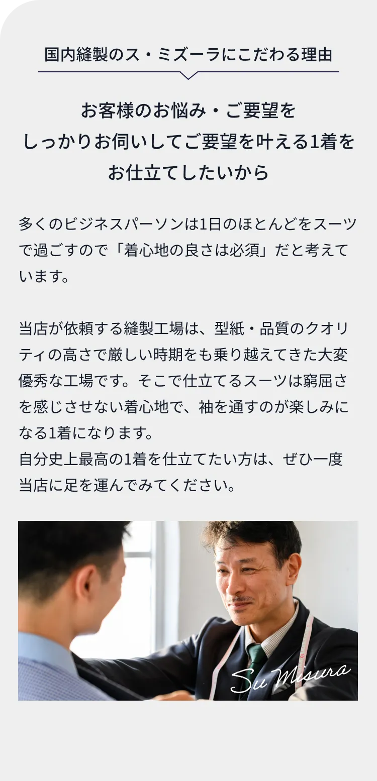 オーナーの木水はテーラー歴25年以上。延べ2万人以上の採寸・オーダーメイドスーツを手掛けてきました。その体形だからこそ格好良く、着心地が良くなるスーツ作りを突き詰めてきました。